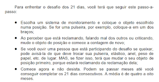 O desafio será proposto a todos os clientes do Espaço do Bem-Estar, incluindo a mim. Com a “pulseira” escolhida, o desafio está lançado. De acordo com o livro, o tempo médio que uma pessoa levou para conseguir foi de 4 a 8 meses.